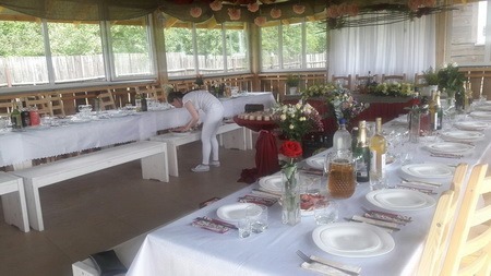 — большой стол для торжеств со стульями (на улице)