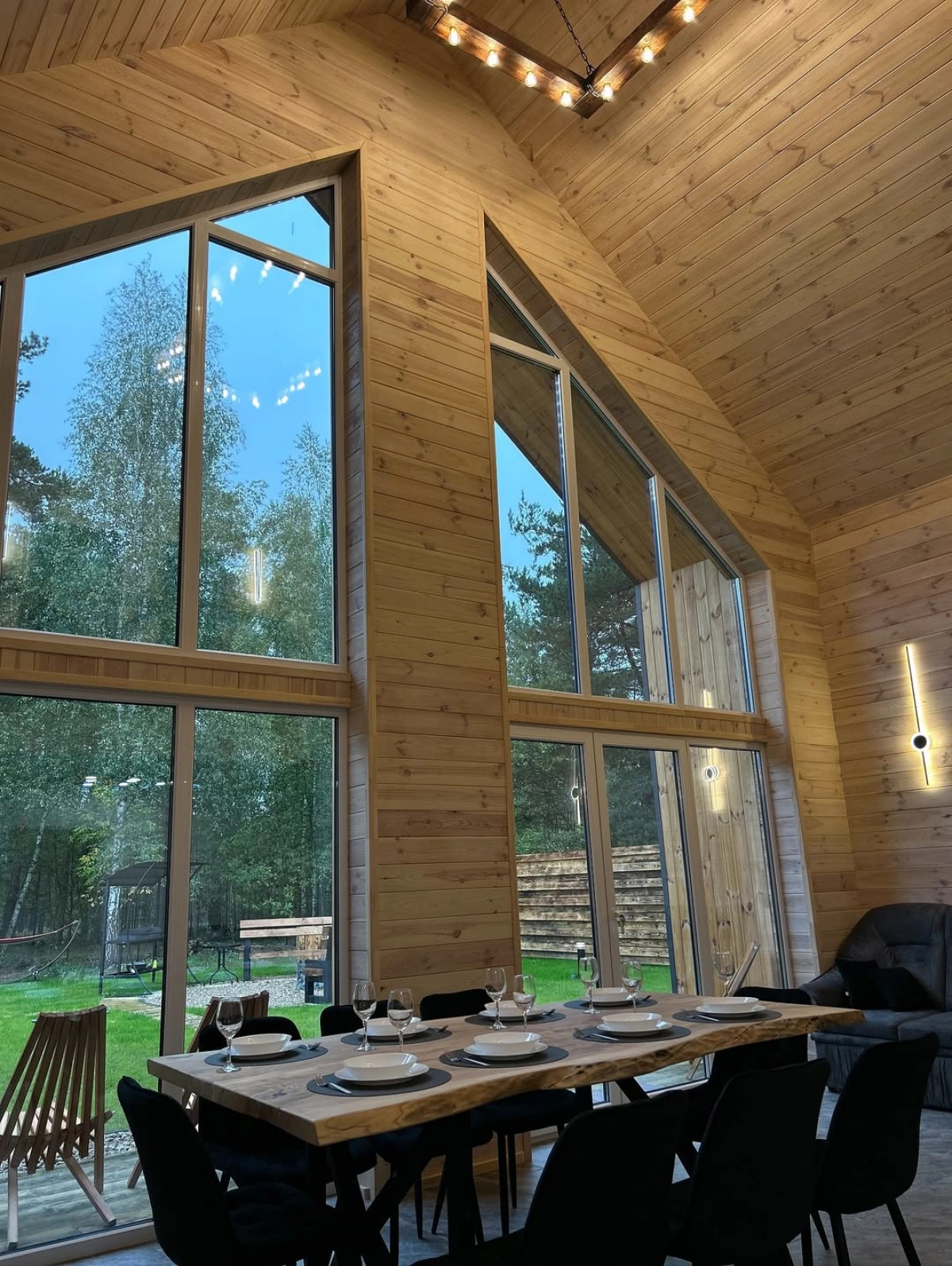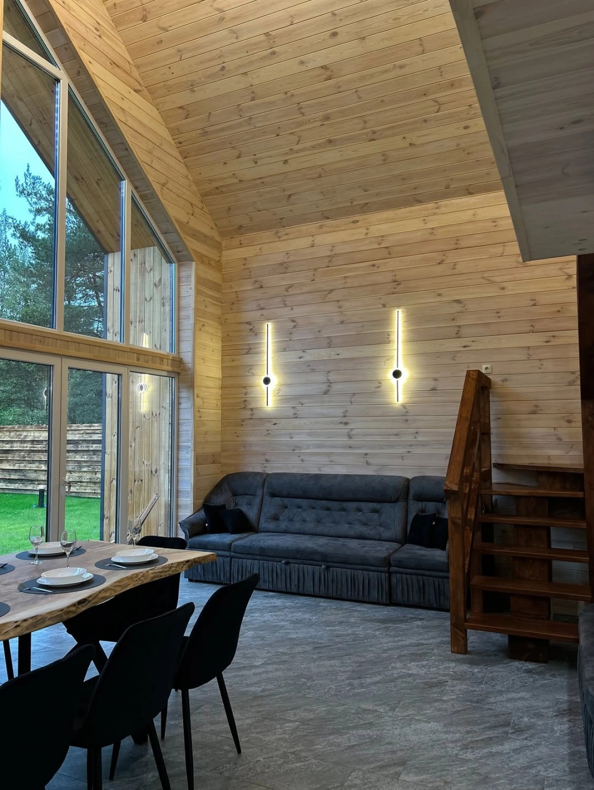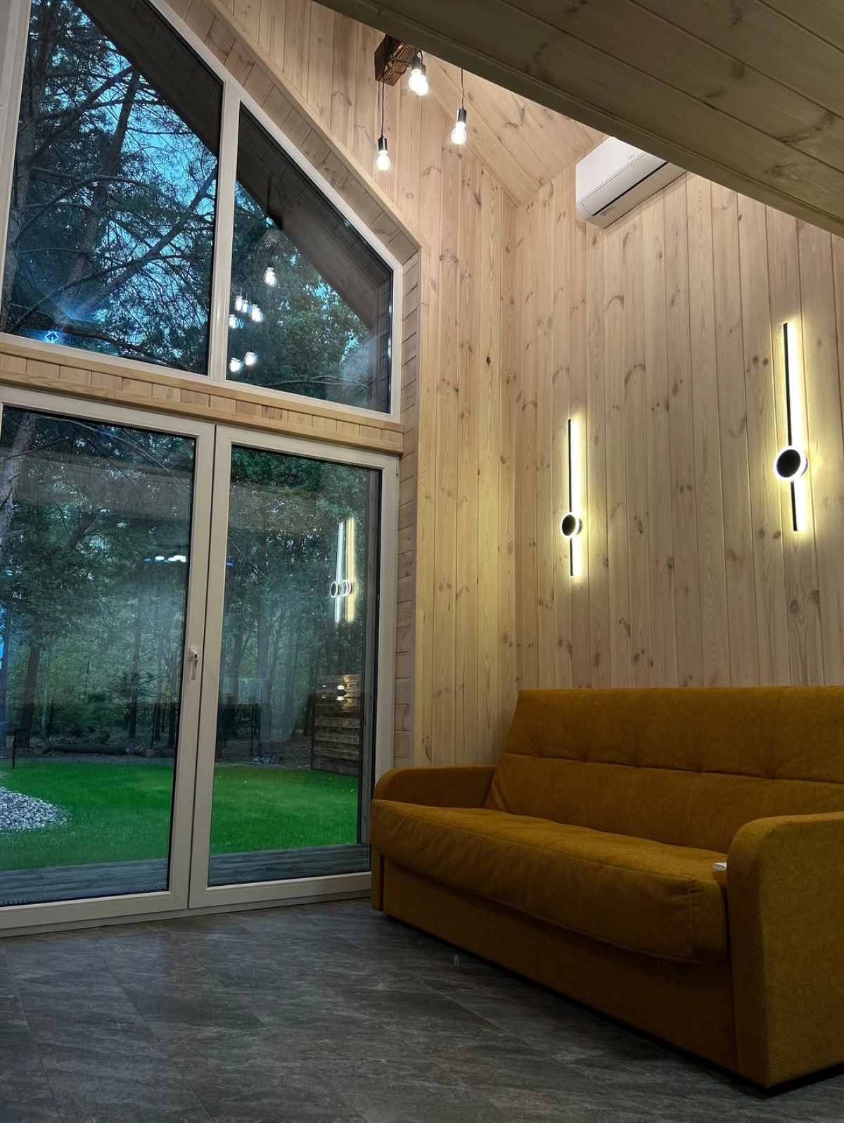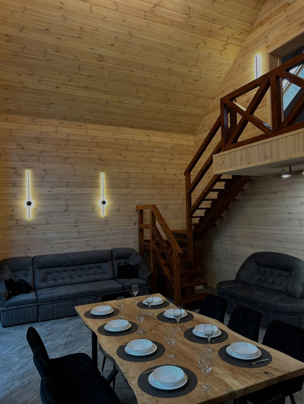 Дом №1: 3 спальни с двуспальными кроватями и гостиная с диван-кроватью, баня на дровах с панорамным остеклением (душ, туалет, кухня, зона отдыха), чан (купель).
