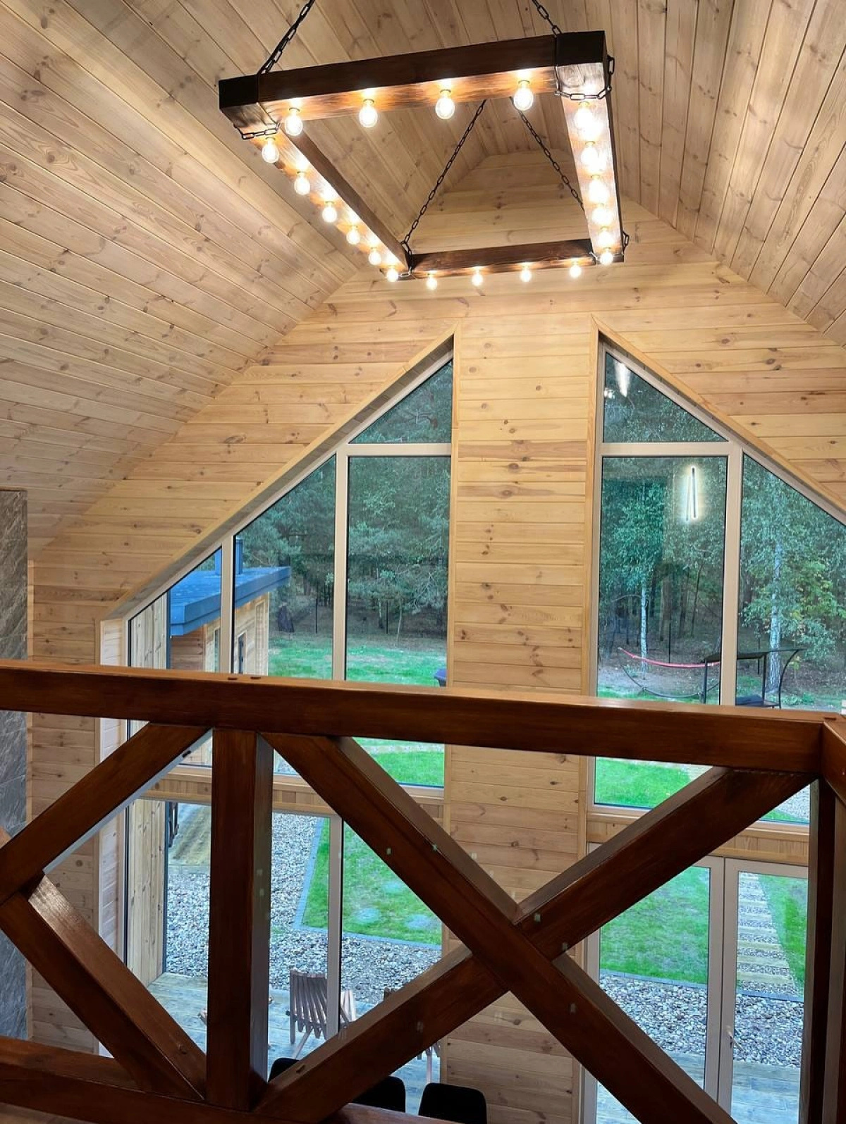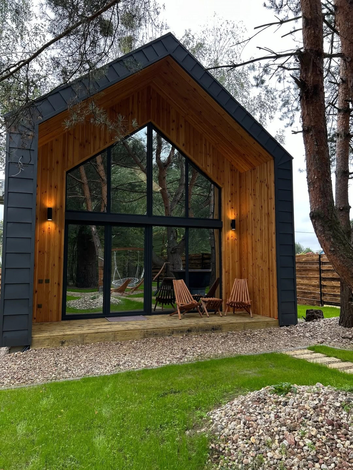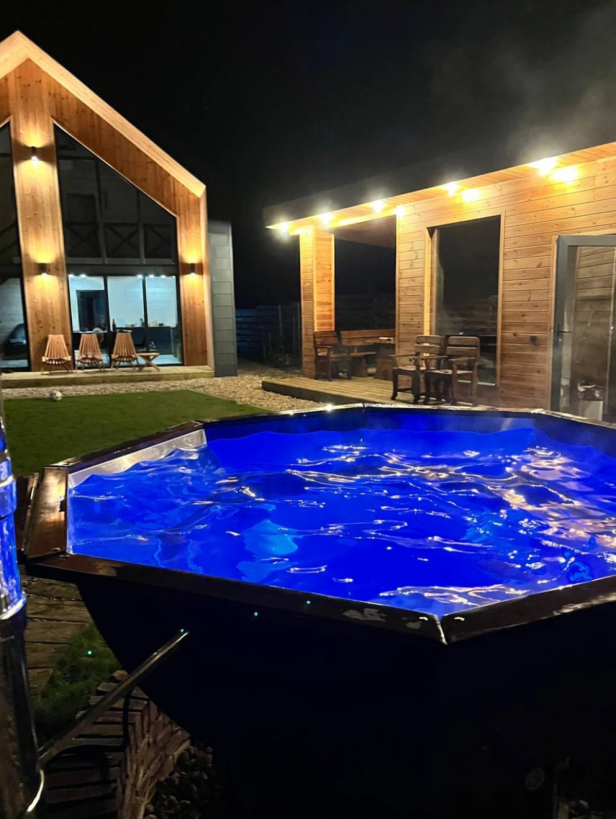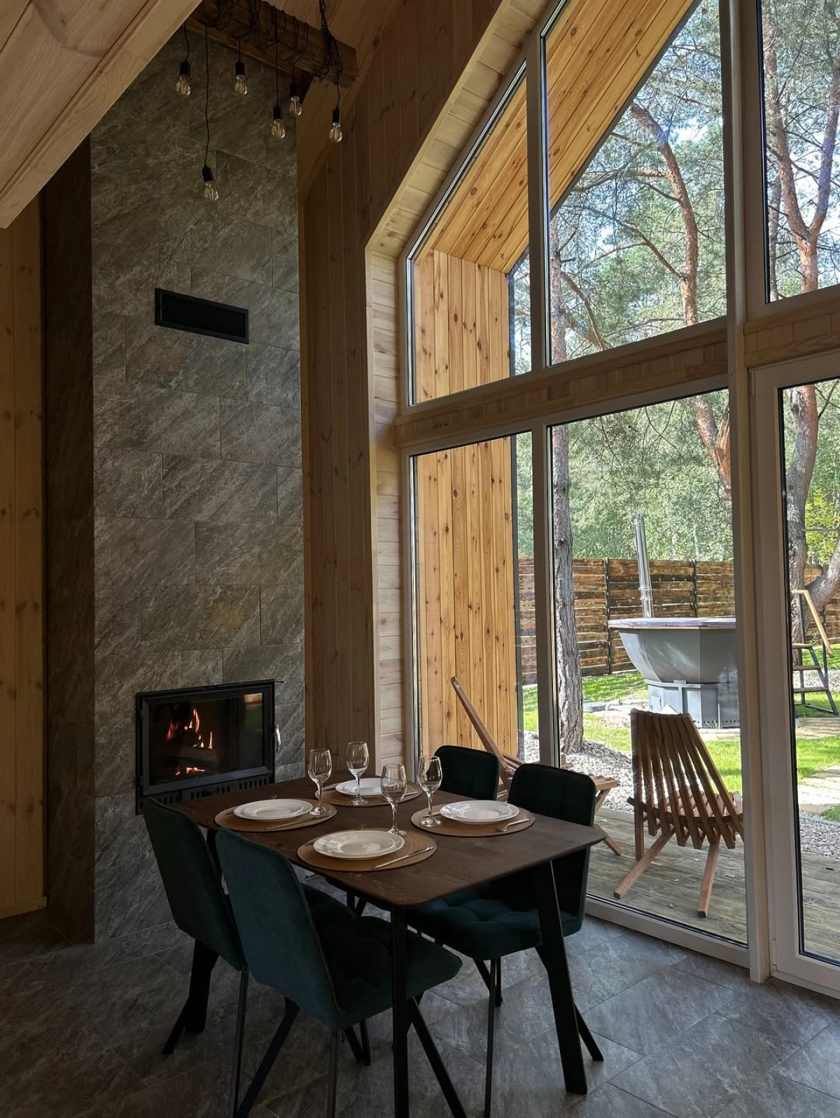 Дом №1: 3 спальни с двуспальными кроватями и гостиная с диван-кроватью, баня на дровах с панорамным остеклением (душ, туалет, кухня, зона отдыха), чан (купель).