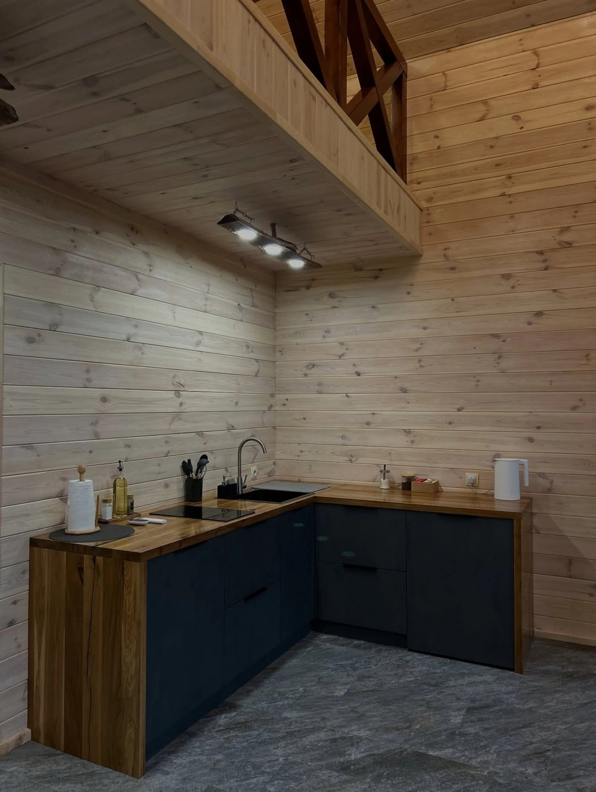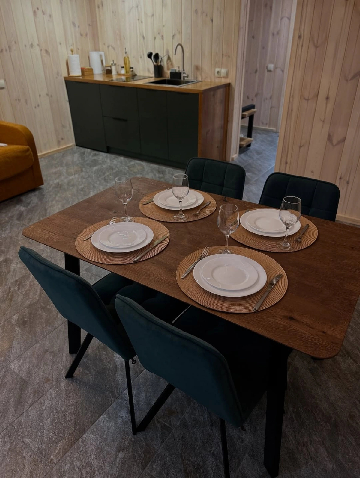 Наша просторная и хорошо оборудованная кухня делает приготовление пищи удовольствием, и вы можете наслаждаться общими блюдами за большим столом внутри или кофе и десертом на уютной террасе. В доме №1 есть посудомоечная машина, а у бани — открытая площадка со столом и лавками для отдыха.