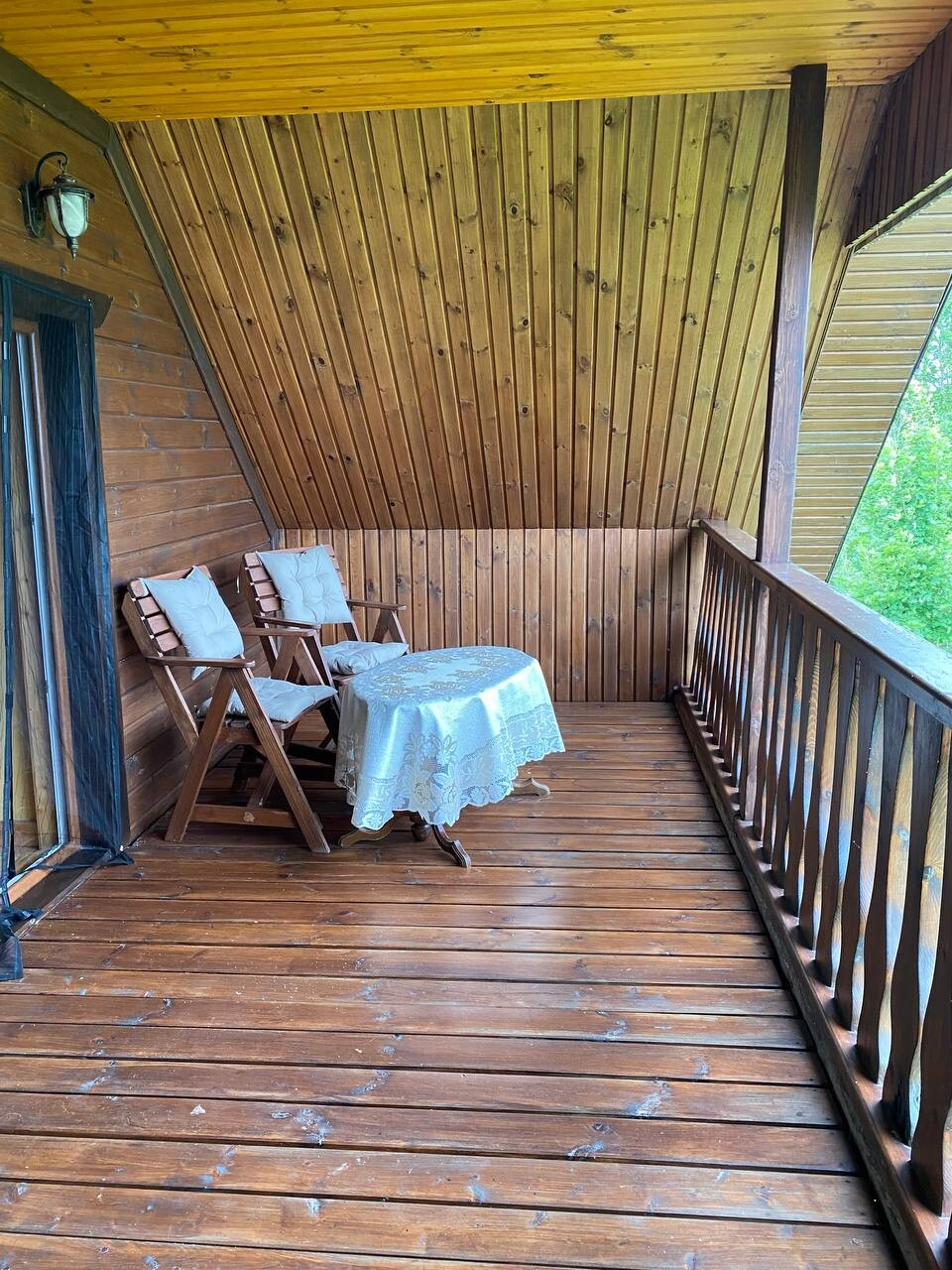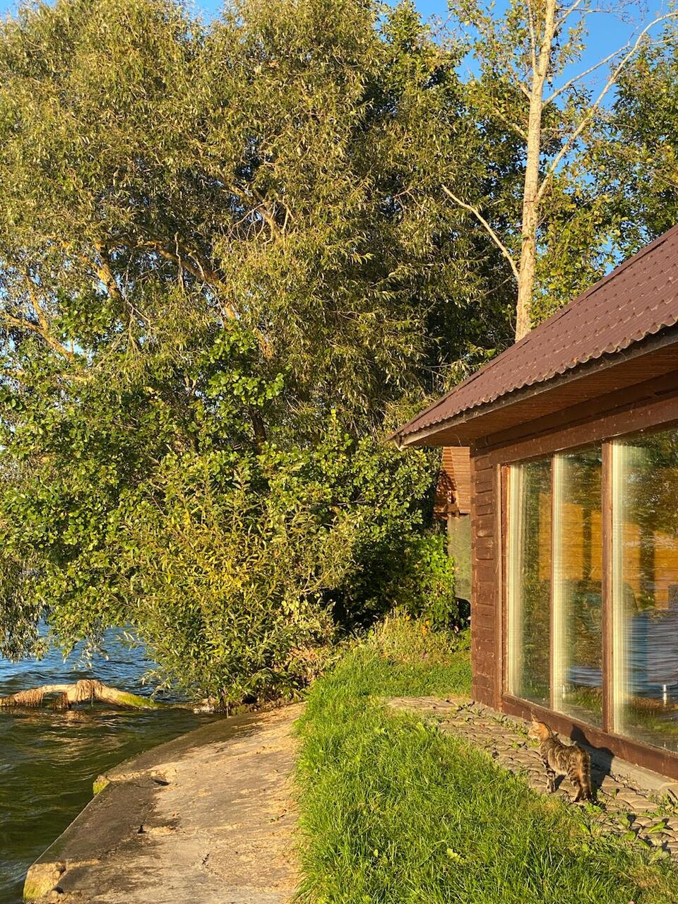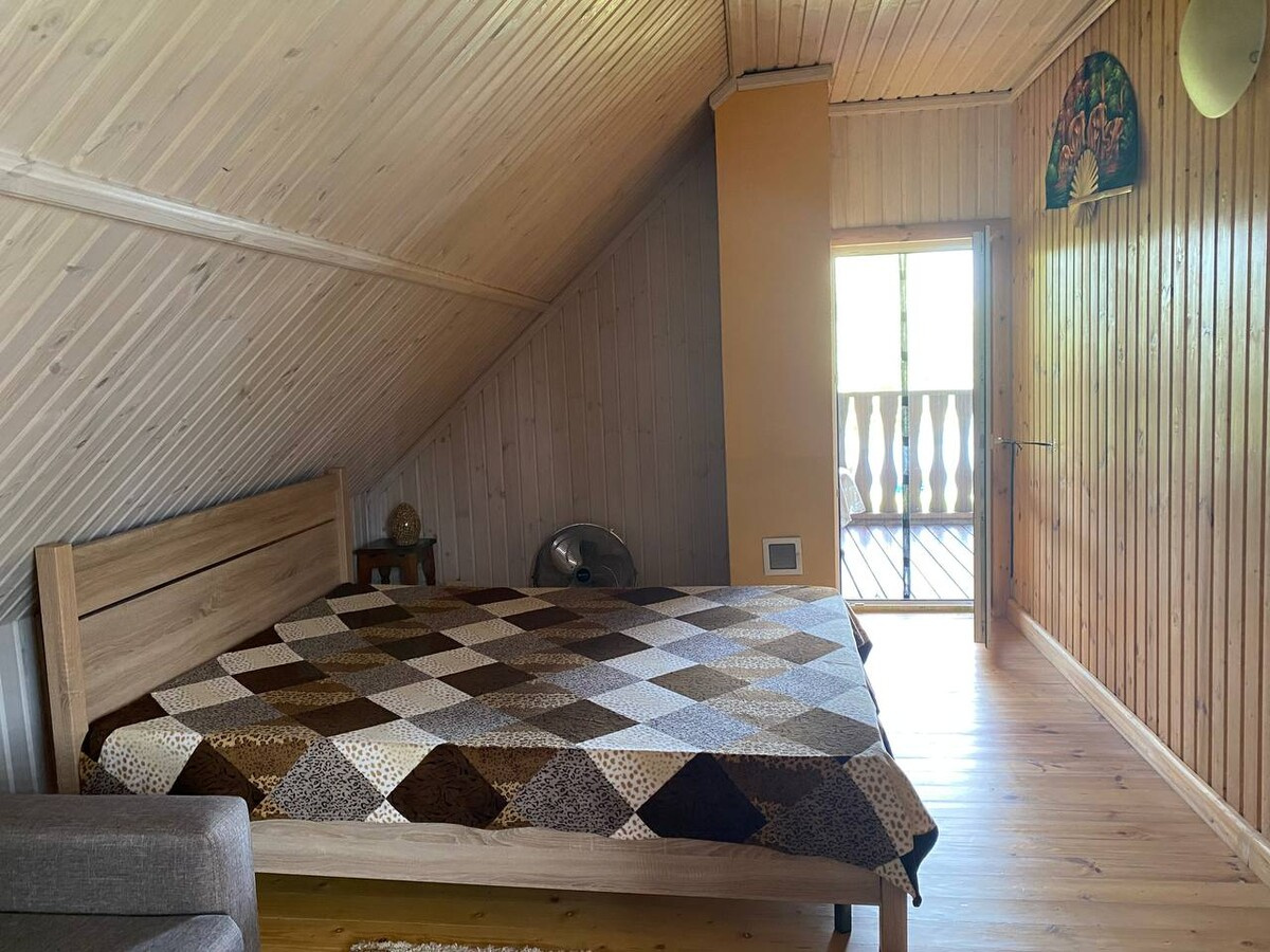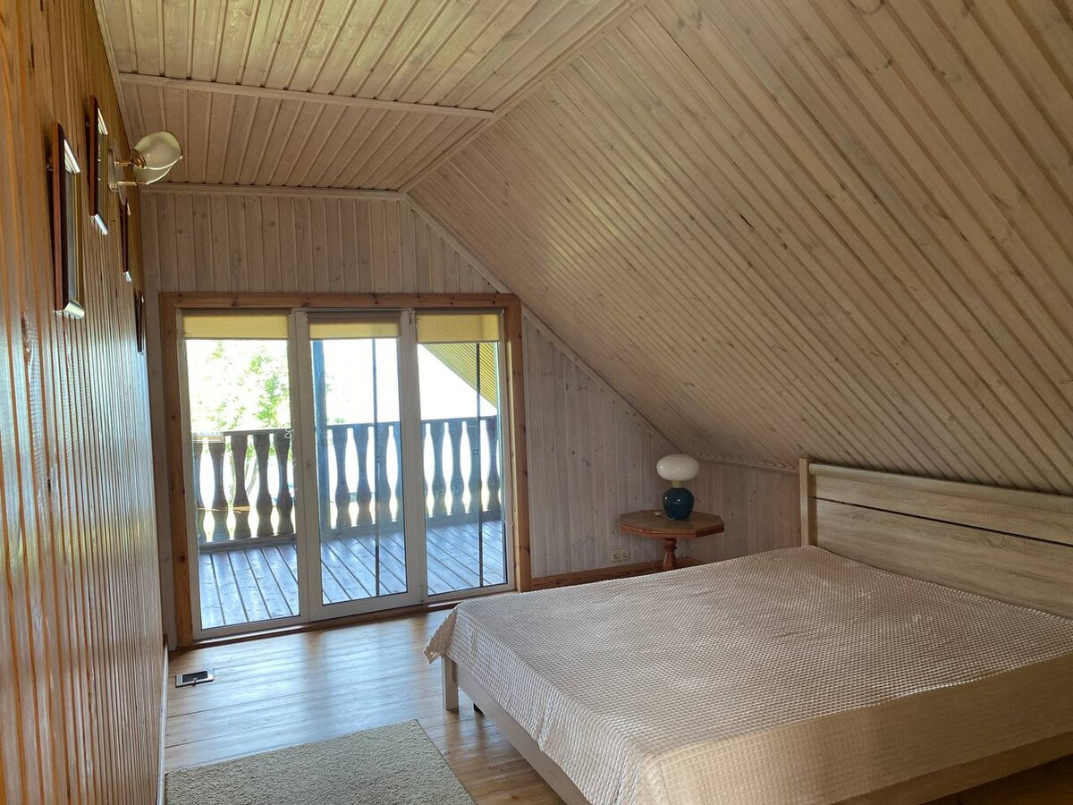 В доме номер 2 на 7 человек есть уютная гостиная с панорамными окнами в пол с видом на озеро, на втором этаже есть 2 уютные спальни с 6 спальными местами. Для любителей попариться за отдельную плату предлагается шикарная русская баня, расположенная прямо в доме. Рядом с домом есть полноценная мангальная и обеденная зона с прекрасным видом на озеро.